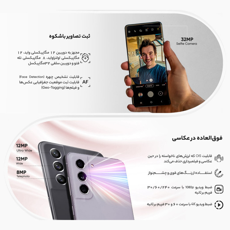 دوربین سلفی : دارای یک دوربین در جلو گوشی | دوربین با رزولوشن 32 مگاپیکسل از نوع عریض با گشودگی دریچه دیافراگم f/2.2 و فاصله کانونی 26 میلیمتر